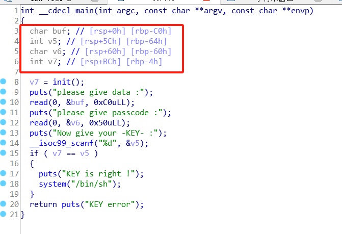 程序最终的判断是v7和v5相等即可得到shell,v7是程序里的,v5是我们的输入,然后这里data可以输入0xc0个字节,这里可以覆盖v7的地址空间。
