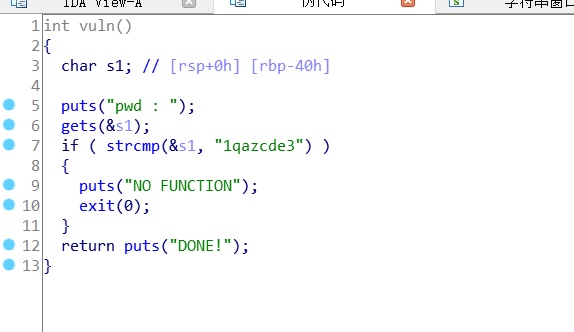 查看伪代码 gets处存在栈溢出,必须首先输入设定的字符串