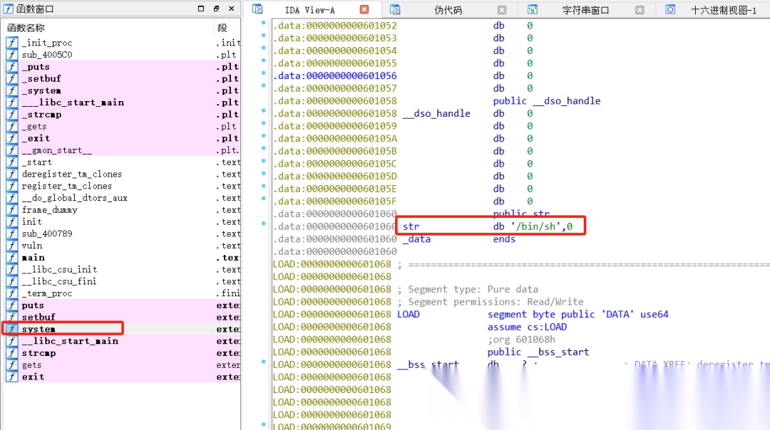 但是溢出后的返回地址,程序里面并没有明显的shell,但是有bin/sh字符串和system函数可以利用
