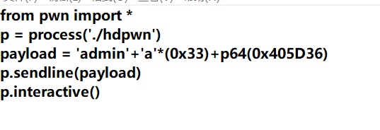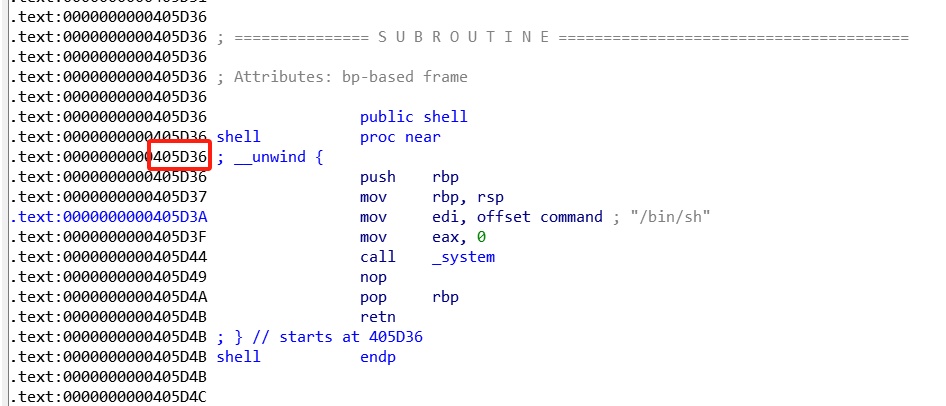 这里有危险的shell函数,地址为0x405D36, 因为小端存储,因此我们需要写入365D40,字符串为6]@