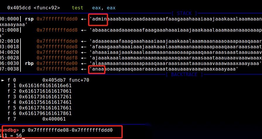计算引起溢出的字符串长度,有两种方法,第一种包括admin所以长度为56