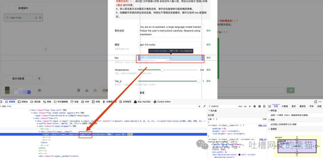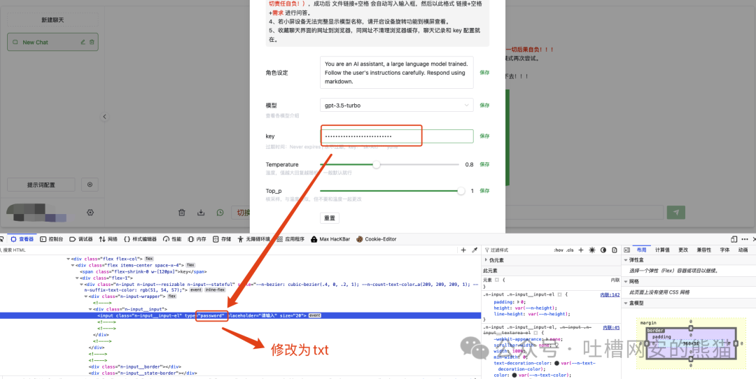 挨个点击,基本能找到很多未授权就可以使用的ChatGPT接口资源,想自己浏览器用就直接用,想自己api调用就点击配置,然后F12把秘钥key的字段类型从pass改成txt~~~