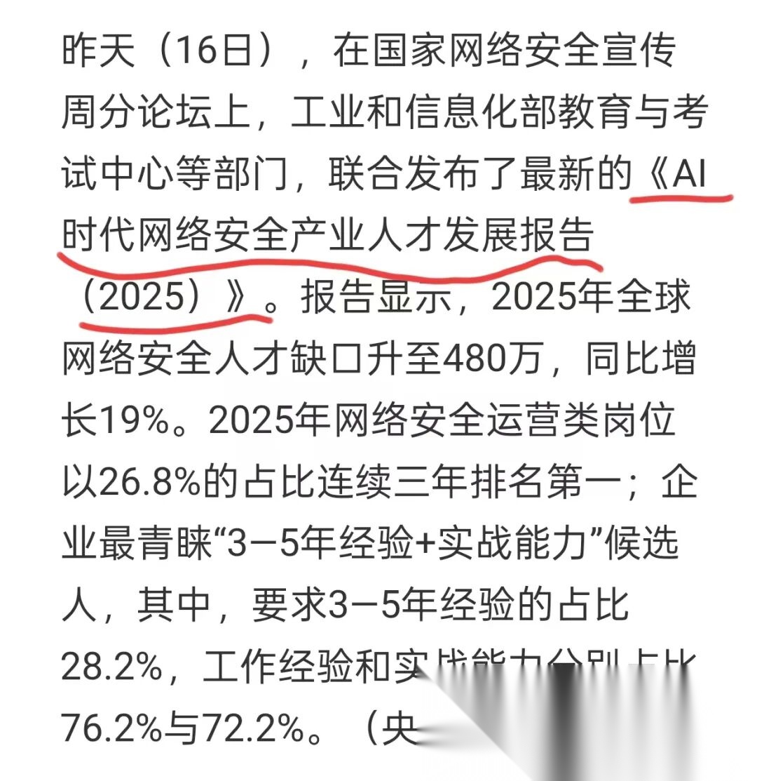 《AI时代网络安全产业人才发展报告(2025)》数据显示,2025年全球网络安全人才缺口升至480万。