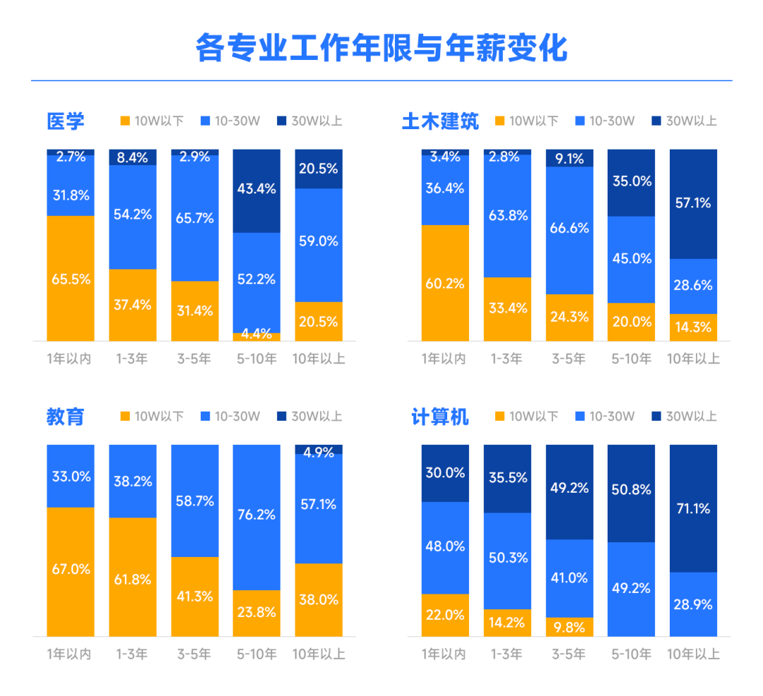 另外,还有专业人士统计了医学、土木建筑、教育、计算机这几个专业的同学工作年限与年薪变化,得出一个结论:计算机起薪高,工作5年薪水更高,10年以上更更高!