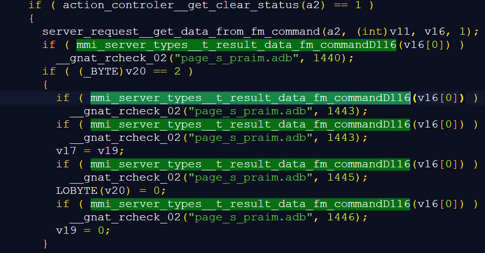 上述代码中的函数mmi_server_types__t_result_data_fm_commandD116是Ada编译器生成的,用于检查变体记录类型的变量中所用的参数是否合法。