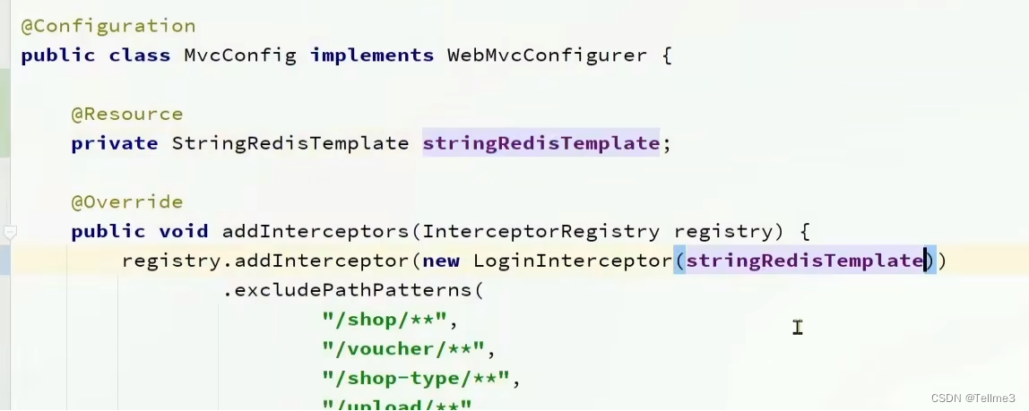 这里的逻辑我解释一下:这里的mvcConfig有@configuration所以我们就可以用注解@Resource去注入获取StringRedisTemplate对象。我们再放进去。那么后面在那里就拿到了