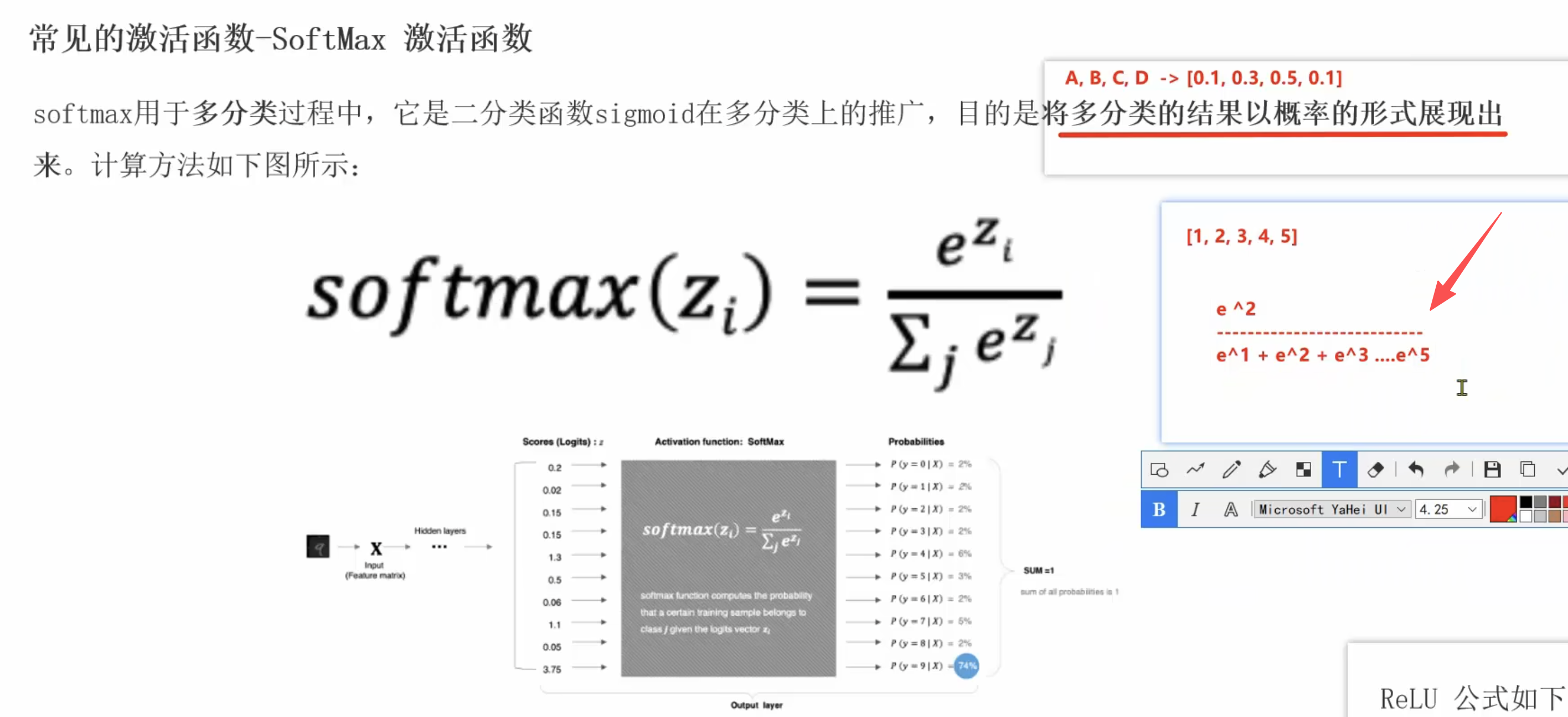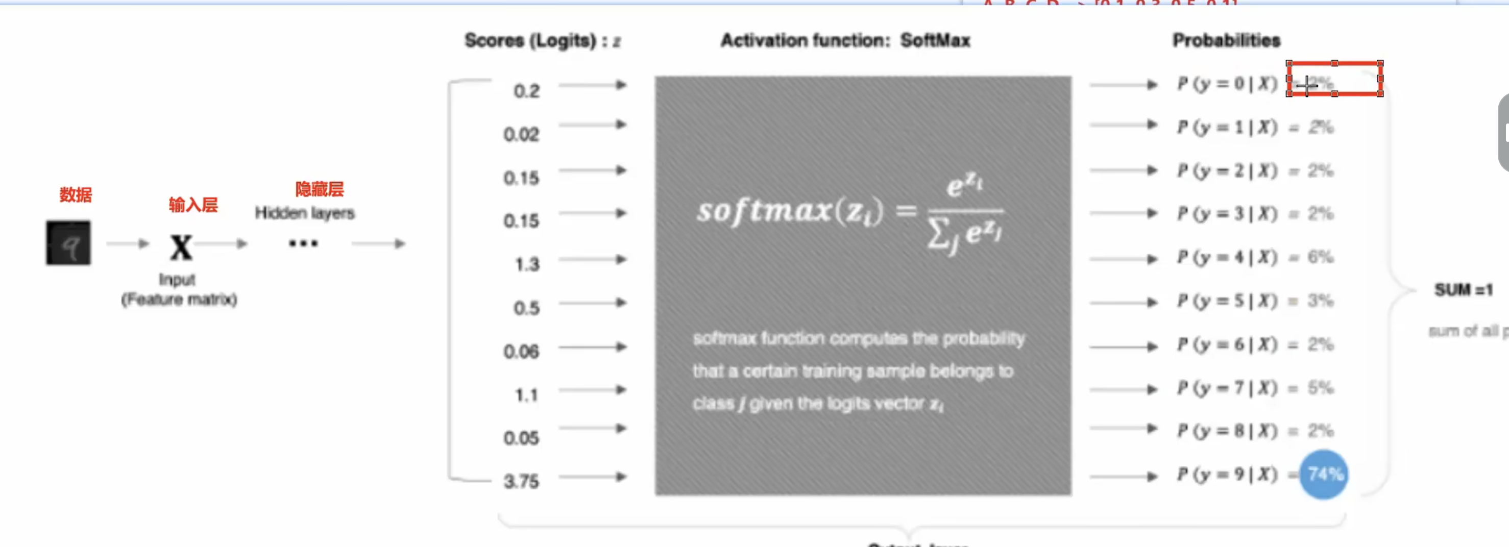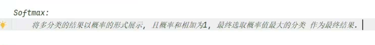- 处理多分类问题,将多分类的结果以概率的形式展出,且所有的分类的概率和为1,且选择概率最大的分类作为结果