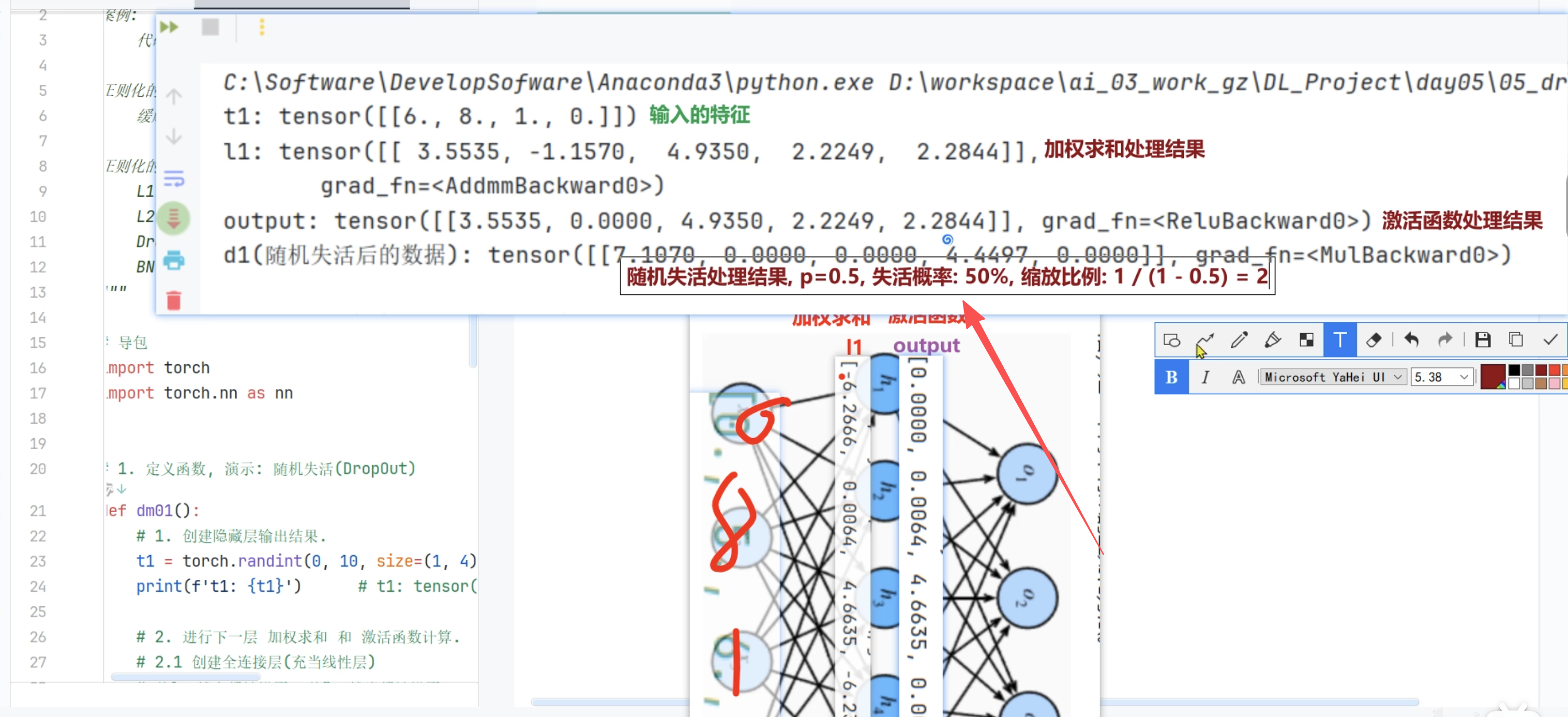 - 也就是会有一定概率,让激活后的值变为0(失活概率),还有一部分被放大(例如p为0.5 ,你们就是1/(1-0.5) = 2, 也就是方法两倍)缩放比例