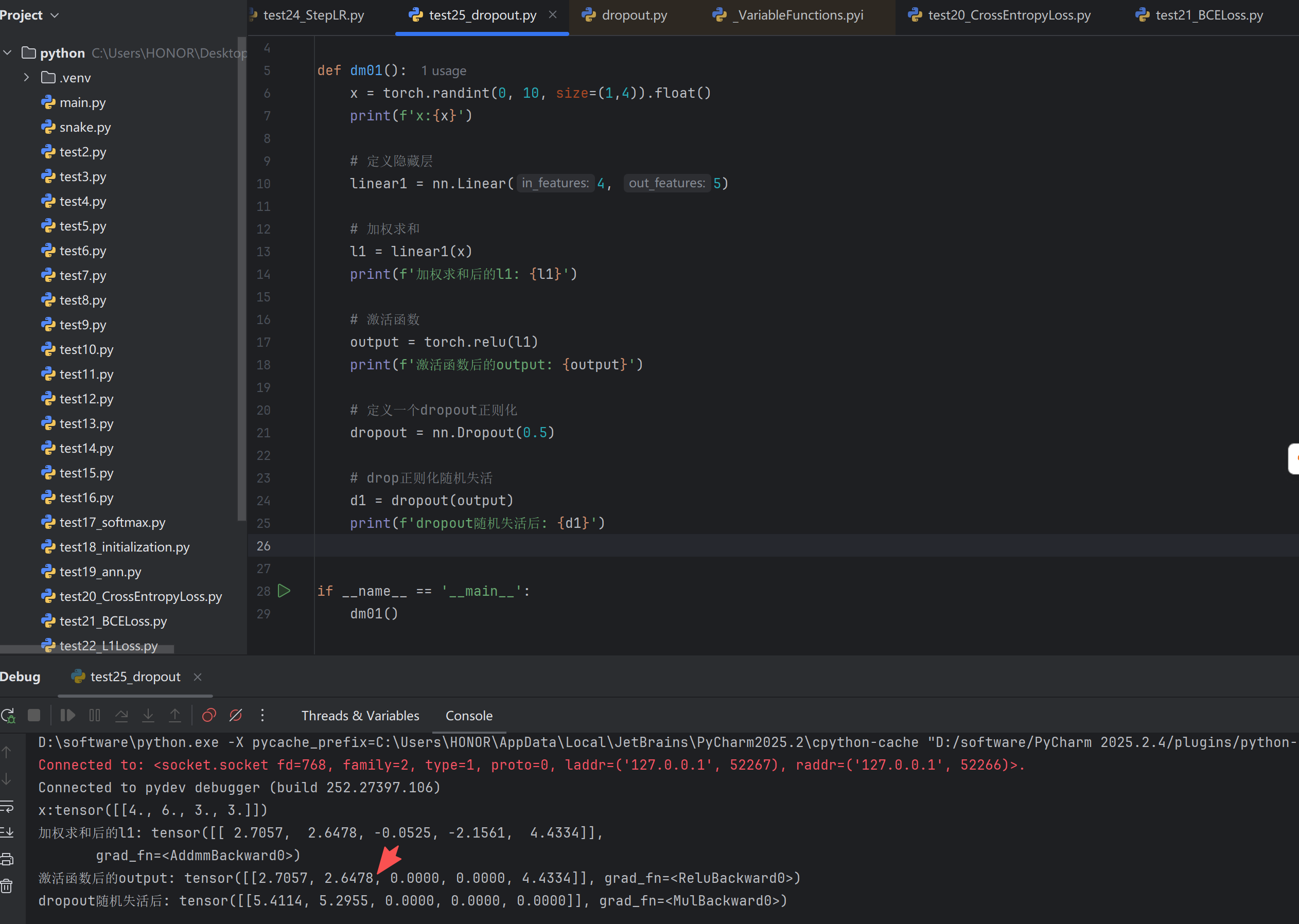 D:\software\python.exe -X pycache_prefix=C:\Users\HONOR\AppData\Local\JetBrains\PyCharm2025.2\cpython-cache "D:/software/PyCharm 2025.2.4/plugins/python-ce/helpers/pydev/pydevd.py" --multiprocess --qt-support=auto --client 127.0.0.1 --port 52266 --file C:\Users\HONOR\Desktop\python\test25_dropout.py