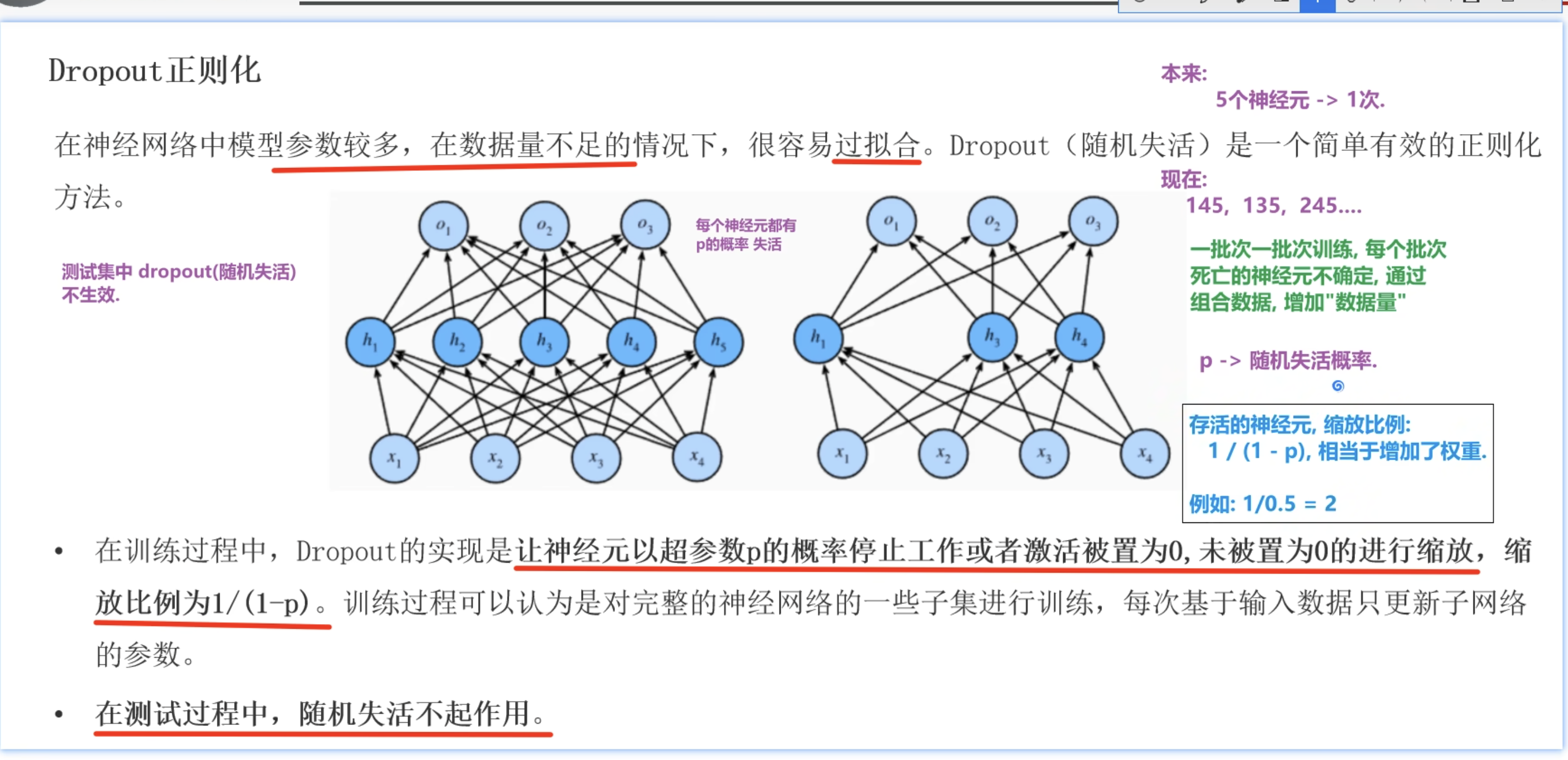 - 就是让神经元以一定p的概率失活。缩放比例为1/(1-p)