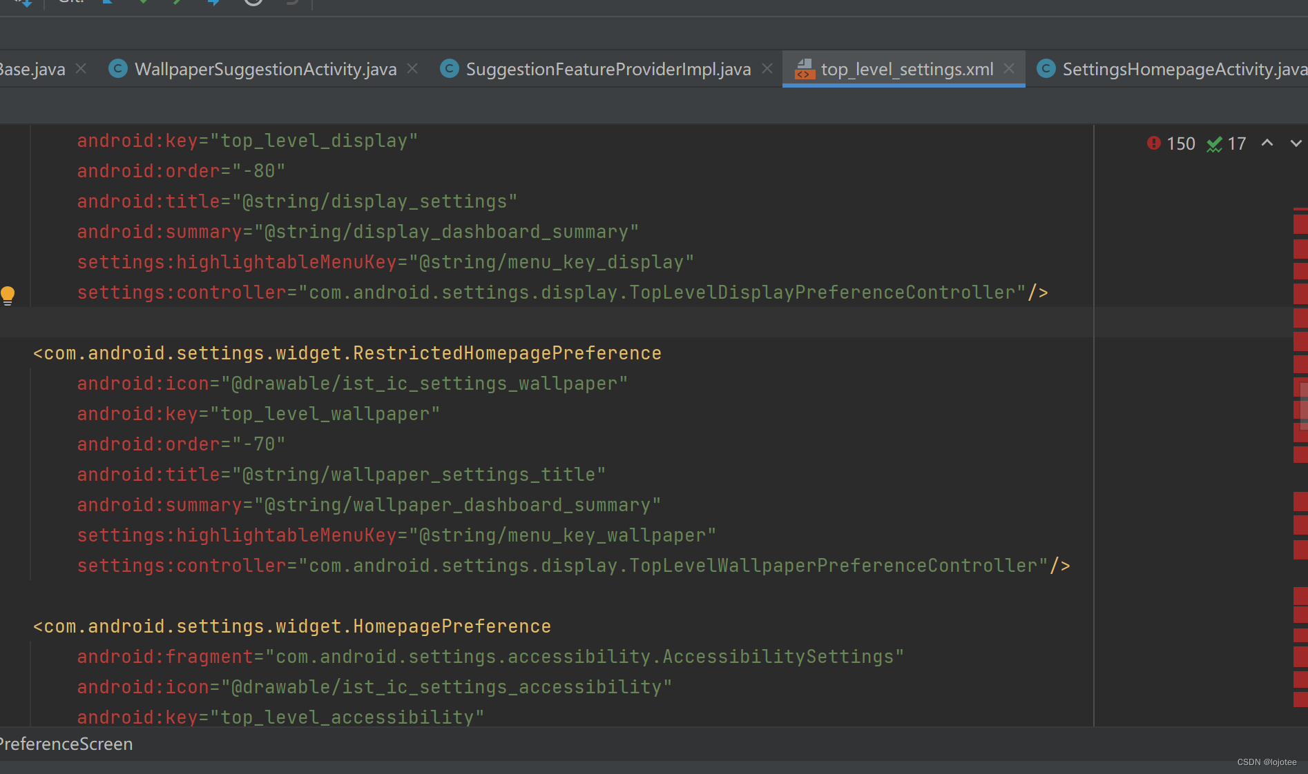 于是找到了,这个RestrictedHomepagePreference,对应的就是TopLevelWallpaperPreferenceController 这个 controller。根据我以往的经验,加个选项无非就是找到对应layout,然后加个Preference,再处理一下逻辑就ok了。但是这里一看就是最外层的,需要进去里面添加。