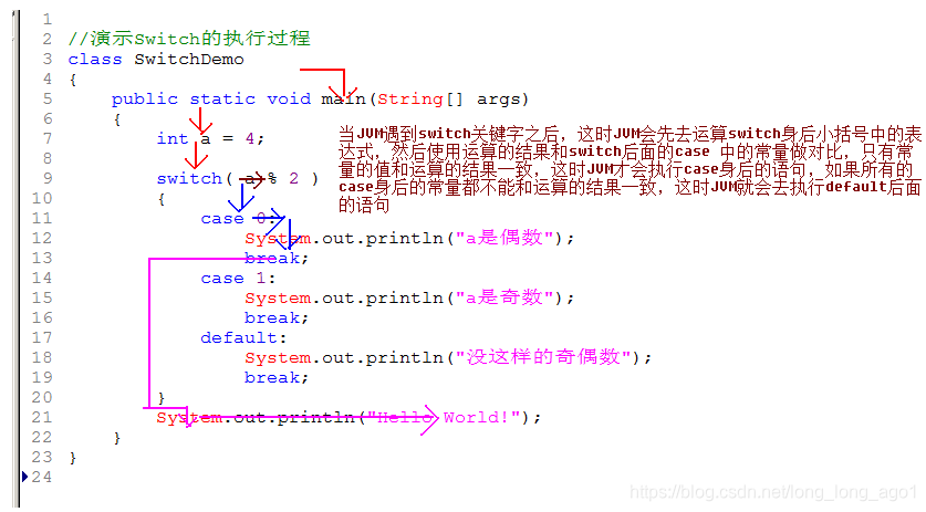 switch语句在执行的时候,JVM是通过switch中的表达式的计算结果和case后面的常量进行比较,相等就代表找到的执行switch后面case的入口,这时如果程序没有break关键字,这时JVM就会把从入口开始往下的所有代码,全部执行,而不管下面的case 后的常量是否和计算的结果一致。