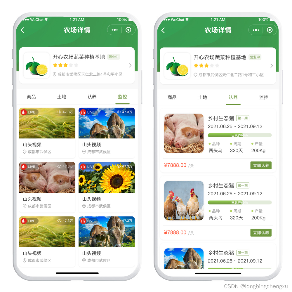 - 消费者端页面设计可以查看认领认养,订单,余额,商城等功能。