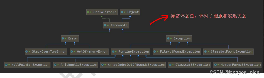 - Exception:其它因编程错误或偶然的外在因素导致的一般性问题,可以使用针对性的代码进行处理。例如空指针访问,试图读取不存在的文件,网络连接中断等等,Exception 分为两大类:运行时异常[程序运行时,发生的异常]和编译时异常[编程时,编译器检查出的异常]。
