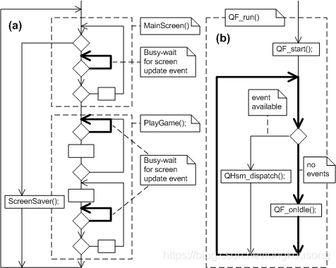一个事件驱动程序运行时,不停的查看可能的事件,当一个事件被探测到,就分派这个事件到合适的状态机构件(见图 1.11(b) )。为了让这个方法可以工作,必须连续频繁的查看事件。这意味者状态机必须很快的运行,这样程序能返回来查看事件。为了符合这个要求,状态机不能进入到需要忙等待一段较长或不确定时间的状态。这种状态最普遍的例子就是在一个状态处理函数内的 while 循环,退出循环的条件,比如按键输入,不受程序的控制。这类一个无限循环的程序结构,被称为“阻塞“代码 ,你可以在 Quickstart应用程序里看到这些例子(见图 1.11(a) )。为了让事件驱动型编程模式能工作,你必须只编写“非阻塞”代码。