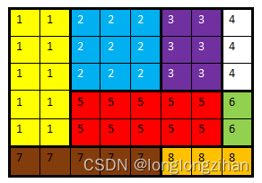 一个n行m列的矩阵被划分成t个矩形区域,分别用数字1-t来标识,同一个区域内的元素都用同一个数字标识。如下图所示,一个6行8列的矩阵被分成8个矩形区域,分别用编号1-8标识。当两个小区域之间公用一条边时,称这两个区域相邻,例如下图中区域5的相邻区域有6个,分别为1,2,3,6,7,8,但4并不是它的相邻区域。请写一个程序找出区域k的所有相邻区域。
