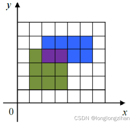 下图给出了一个画了两个矩形的例子。第一个矩形是(1,1) 到(4, 4),用绿色和紫色表示。第二个矩形是(2, 3)到(6, 5),用蓝色和紫色表示。