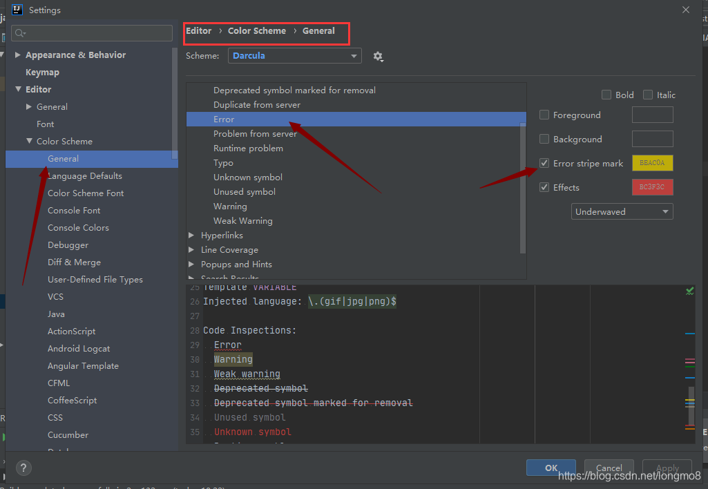 Idea在黑色背景下,错误提示不明显,可以改成黄色,设置路径如下图: