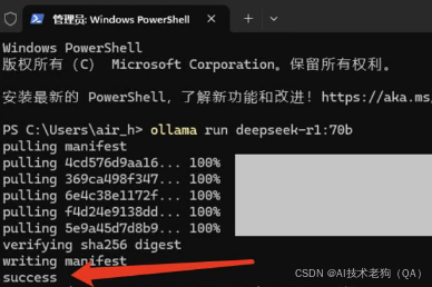 接着输入【ollama run 模型名称(NAME)】,我这里是【ollama run deepseek-r1:70b】