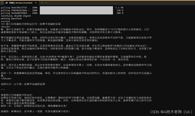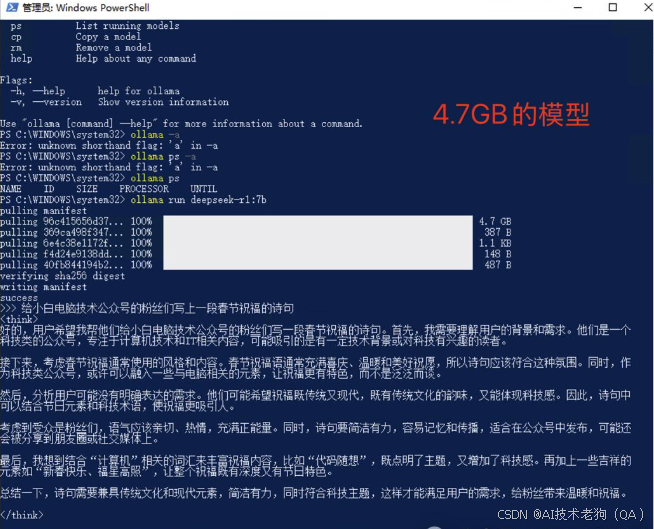 (模型会直接安装在C盘,请注意C盘的可用空间!)这里尝试安装一下43GB的版本,复制刚刚的【ollama **** *b】命令行,粘贴到【PowerShell(管理员】运行框,然后回车