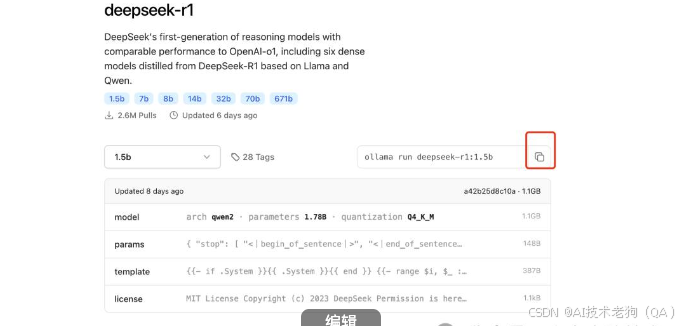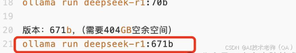 版本:1.5b,适用于一般文字编辑使用(需要1.1GB空余空间)ollama run deepseek-r1:1.5b版本:7b,DeepSeek的第一代推理模型,性能与OpenAl-01相当,包括从基于Llama和Qwen的DeepSeek-R1中提取的六个密集模型(需要4.7GB空余空间)ollama run deepseek-r1:7b版本:8b,(需要4.9GB空余空间)ollama run deepseek-r1:8b版本:14b,(需要9GB空余空间)ollama run deepseek-r1:14b版本:32b,(需要20GB空余空间)ollama run deepseek-r1:32b版本:70b,(需要43GB空余空间)ollama run deepseek-r1:70b版本:671b,(需要404GB空余空间)ollama run deepseek-r1:671b