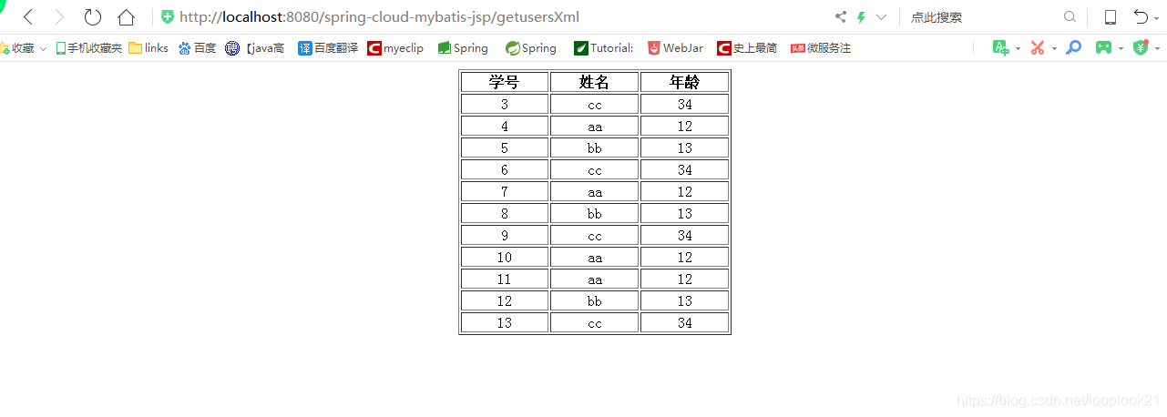 读取数据:http://localhost:8080/spring-cloud-mybatis-jsp/getusersXml
