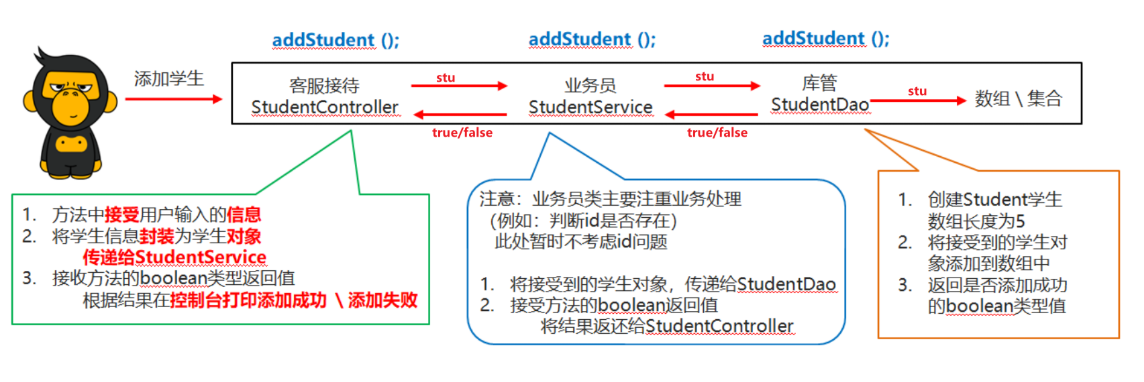 - StudentController类 和用户打交道(接收用户需求,采集用户信息,打印数据到控制台)
