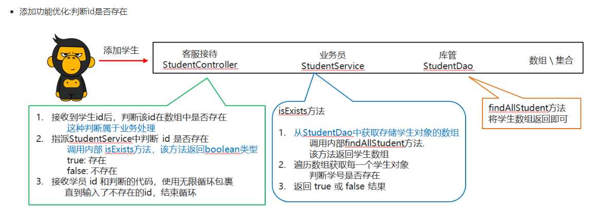 - StudentService类 用来进行业务逻辑的处理(例如: 判断录入的id是否存在)