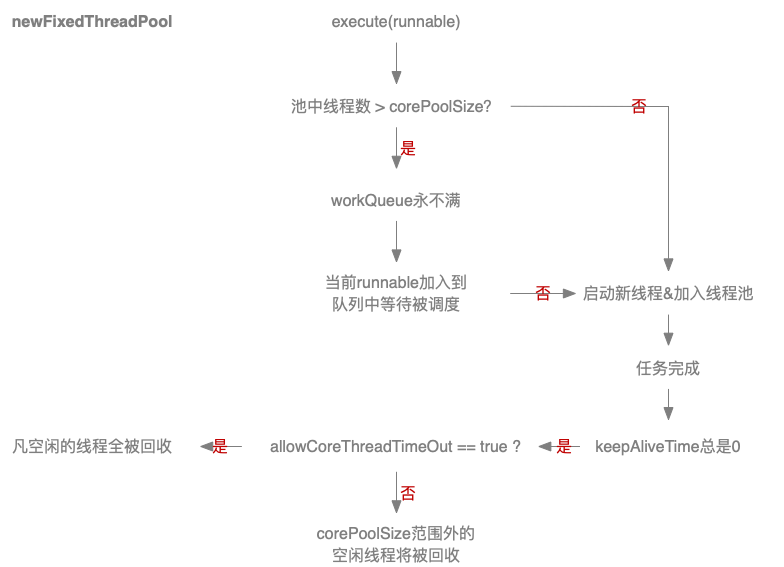 可以看到,虽然创建了10个线程,但始终只有3个在工作。定长线程池在实际中用的比较多,尤其是一些可估算工作量的任务时。它的程序流程图是这样的: