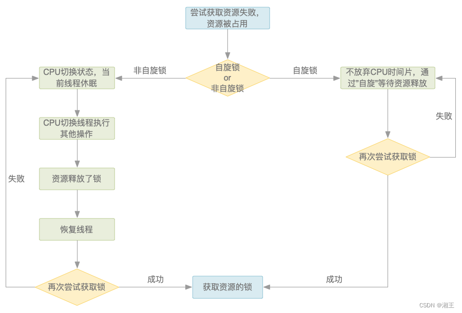自旋锁,一种无需切换线程状态就能检查是否能持有资源的锁,它的流程图是: