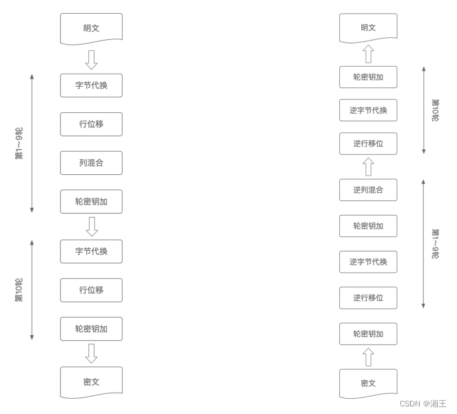 AES的加密过程大体上可以分为字节代换、行位移、列混合和轮密钥加这几个步骤,把DES的混淆和扩散最大化。AES也采取分组加密的方式,就是把一段话分成几段,每一段分别加密,然后再把它们拼接到一起成为密文。同样会把明文用相同的加密方法重复加密很多次。