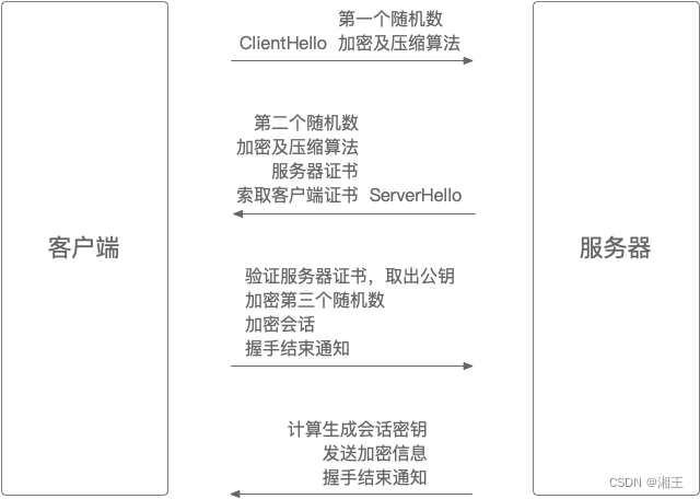 1、客户端发出加密通信请求(ClientHello),并向服务器提供:用于会话密钥的随机数(第一个随机数)、加密算法和压缩算法;