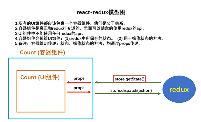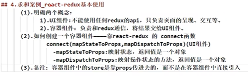 3.使用react-redux后不用自己检测redux中的状态改变了,容器组件可以自动完成此任务