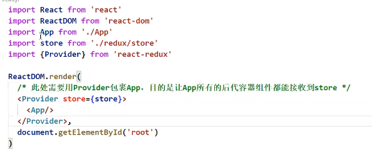 2.无需自己给容器组件传递store,对<App/>整体包裹一个<Provide store = {store}>即可