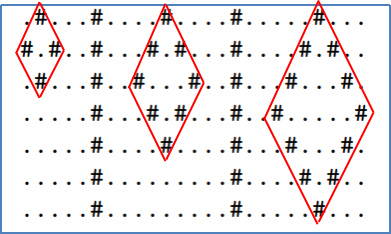 Alice 有一个包含 n 行和 m 列的表格,其中每个单元格的字符为“.”或者“#”。把一个正方形旋转 45 度会变成菱形,形状如钻石。要将表格中的某区域视为钻石,其形状必须如正方形旋转 45 度后的菱形,且边缘必须仅由字符“#”组成,且其内部必须完全由“.”填满,不能为空。钻石外字符不作要求。