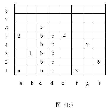 骑士可以按照移动规则自由地在棋盘上没有障碍物的格子中移动。图(b)给出了一个骑士移动的例子,也就是输入样例中第一组数据对应的例子。初始格子用“n”标记,目标格子用“N”标记,有障碍物的格子用“b”标记。一个可行的移动序列在图中用数字标记出来(a1,b3,a5,c6,e5,g4,h2,f1)。 总共需要7步才能完成。事实上,这也是最少的步数了。