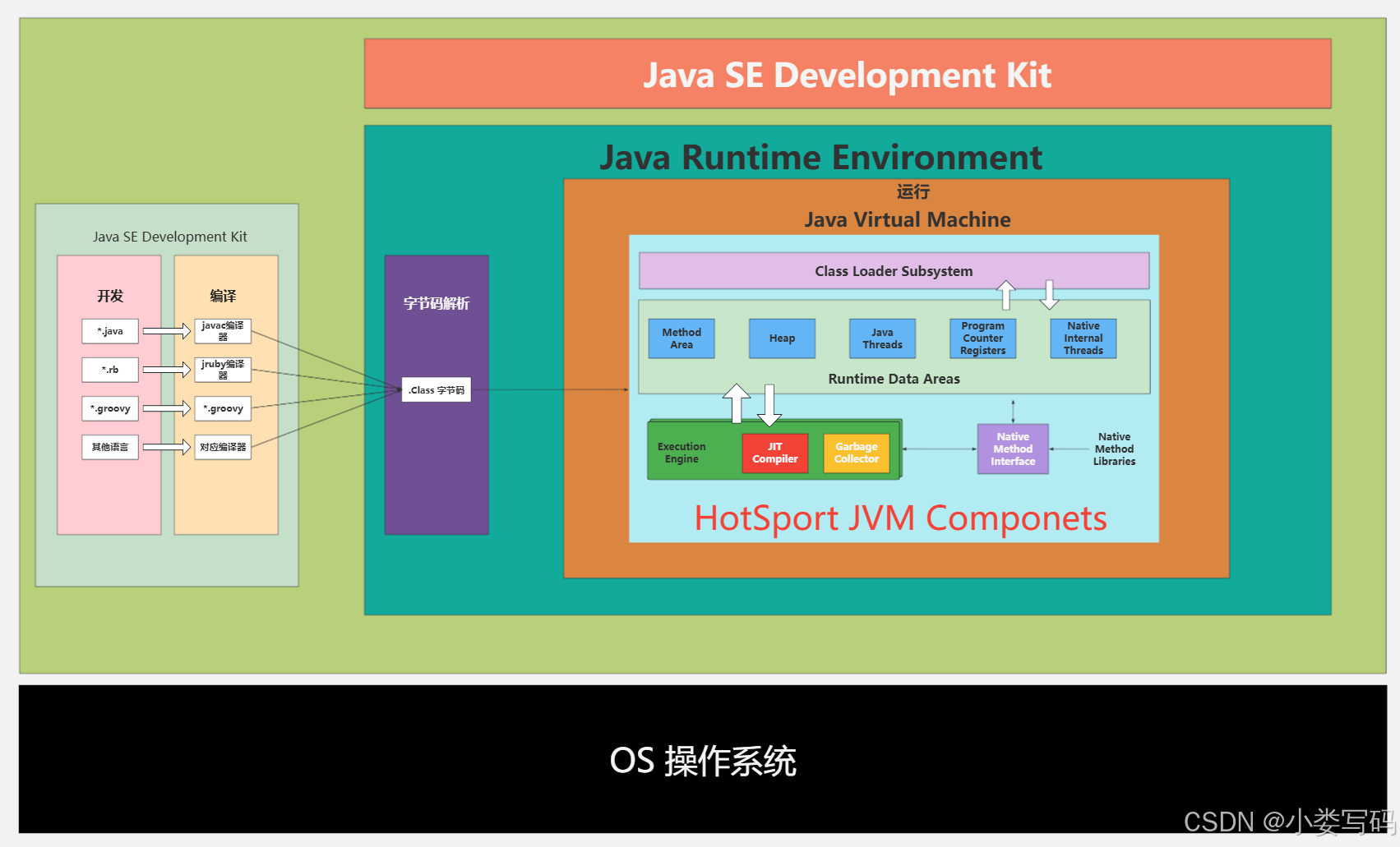 JVM(Java Virtual Machine),Java 虚拟机,是JRE内的一部分。它是整个Java 实现跨平台的最核心的部分,负责解析执行字节码文件的虚拟机计算机。所有平台的JVM向编译器提供相同的接口,而我们编译器只需要面向虚拟机,生成虚拟机能识别的代码(字节码),然后由虚拟机来解释执行。