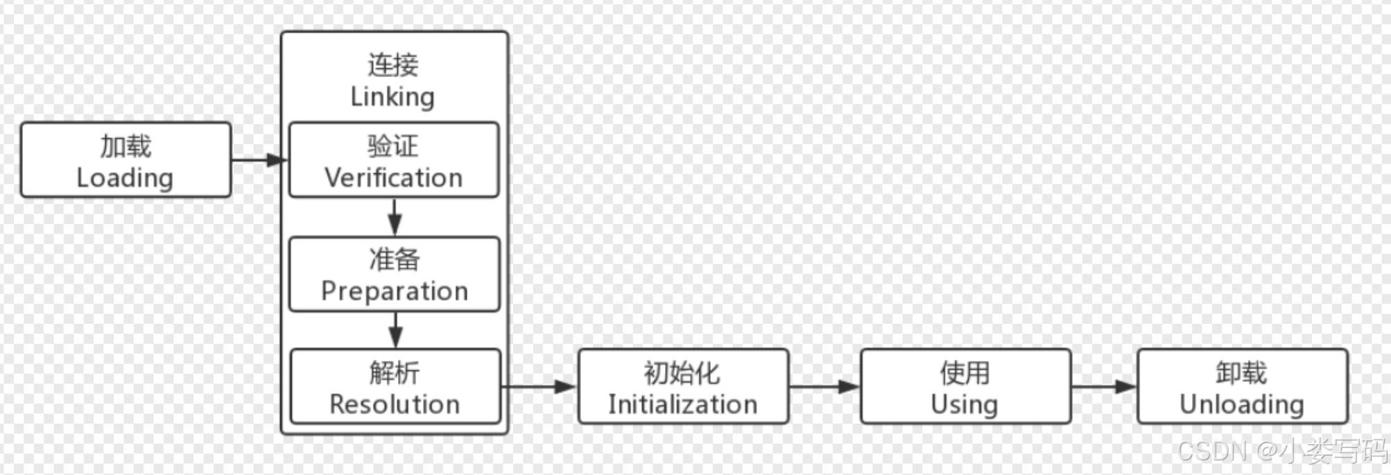 只有加载步骤中的读取二进制流与初始化部分,能被上层开发者,也就大部分的Java程序员控制,而剩下的步骤,都是由JVM去掌控,其中的细节是由JVM开发人员处理,对于上层开发者者是一个黑盒。我们程序员实现了,热部署自定义加载的等等的功能。