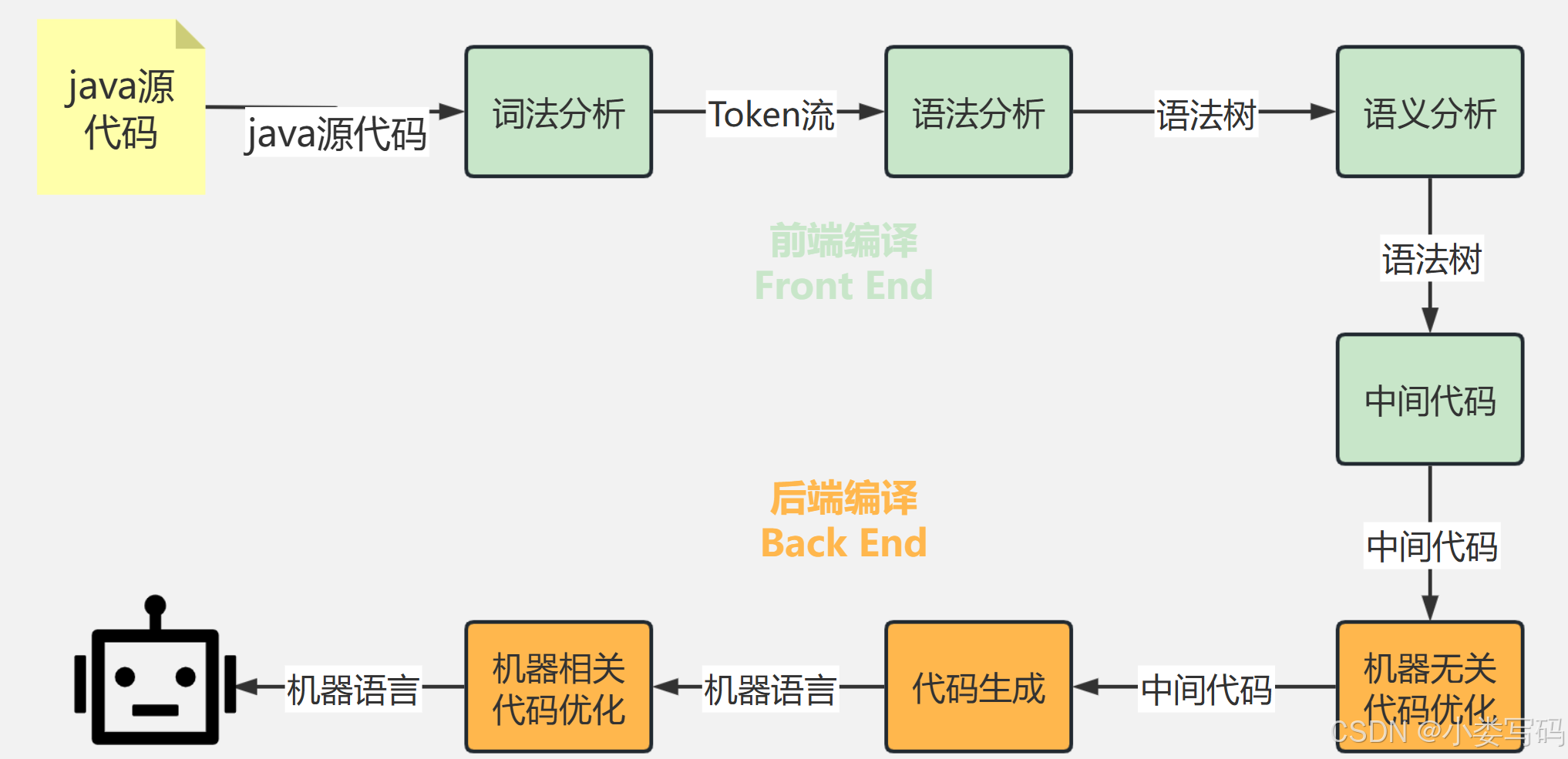 对于大部分程序只需要关注前端编译,是将我们的javac 编译器把java文件编译成字节码,然后加载到JVM的这个流程