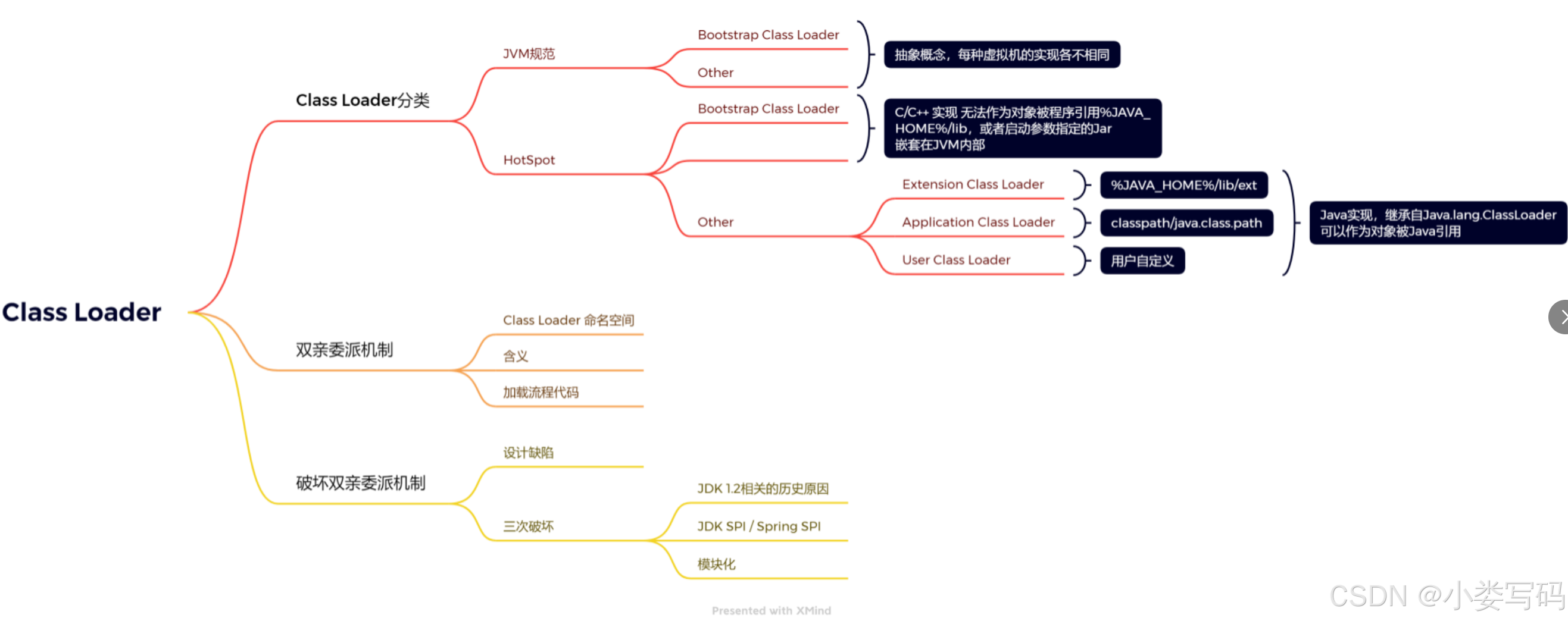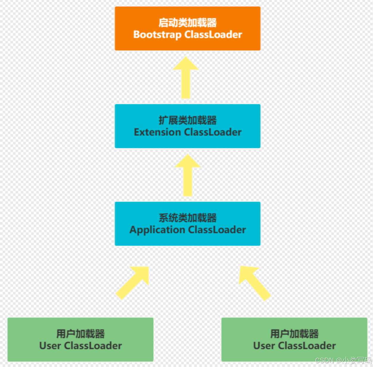 C++实现,并非java代码实现,所以在JVM虚拟机规范中的支持两种类型的类加载器,分别为引导类加载器(Bootstrap ClassLoader)和自定义类加载器(User-Defin ed ClassLoader),什么拓展类,应用程序类、自动类都可以称为自定义类加载器
