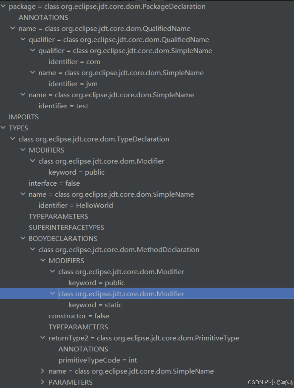 上述这段代码生成的抽象语法树如下( IDEA JDT AstView 插件可以查看抽象语法树):