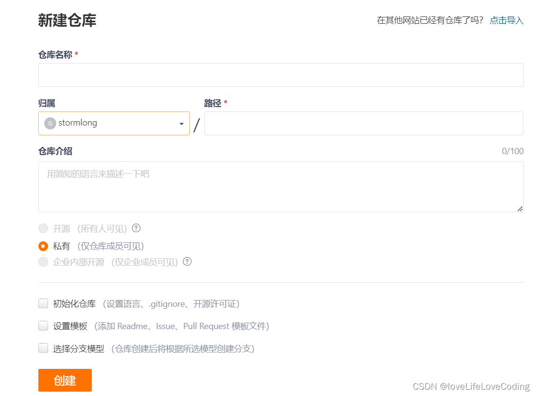 1:在 gitee 上创建以自己项目名称命名的空项目