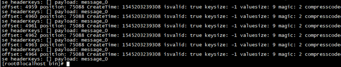 如上图,有3段的LogSegment。segment file 由 2 大部分组成,分别为 index file 和 data file,此 2 个文件一一对应,成对出现,后缀".index"和“.log”分别表示为 segment 索引文件、数据文件.segment 文件命名规则:partion 全局的第一个 segment从 0 开始,后续每个 segment 文件名为上一个 segment文件最后一条消息的 offset 值进行递增。数值最大为 64 位long 大小,20 位数字字符长度,没有数字用 0 填充。这里可以看到第二段的segment的名字后面是4965,那么在前一段的Segment中最后一条消息的offset是4964,以此类推.我们可以通过如下命令去查看这个log文件看看: