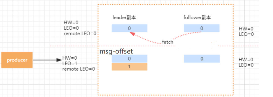 2. 更新 remote LEO=1, 因为这次 fetch 携带的 offset 是1.