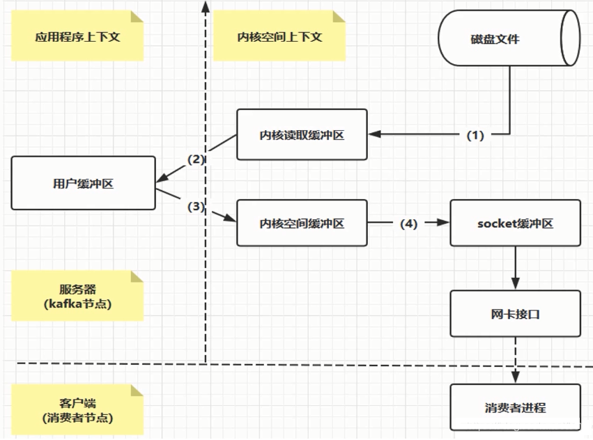 零拷贝:直接让操作系统的cache中的数据发送到网卡后传输给下游的消费者,直接跳过了两次拷贝数据的步骤,Socket缓存中仅仅会拷贝一个描述符过去,不会拷贝数据到Socket缓存。
