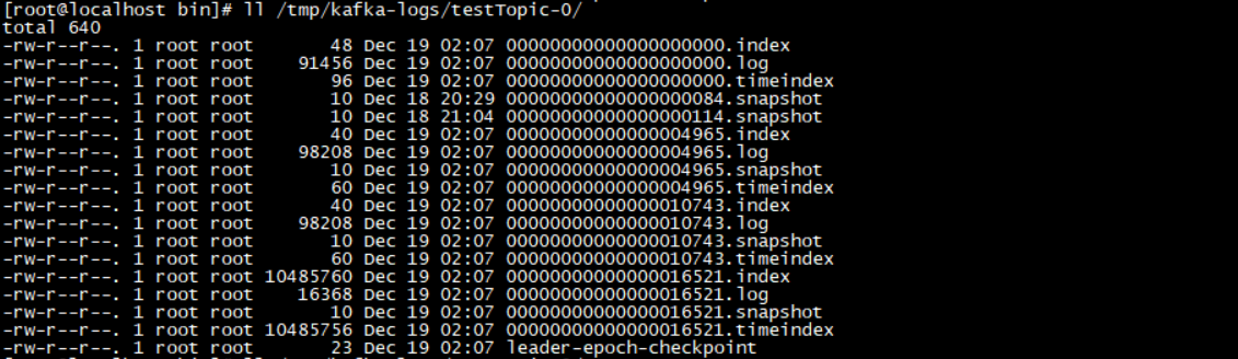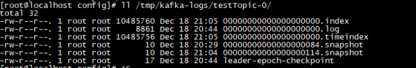 前面我们知道了一个 topic 的多个 partition 在物理磁盘上的保存路径,那么我们再来分析日志的存储方式。通过 ll /tmp/kafka-logs/testTopic-0/ 命令找到对应 partition 下的日志内容: