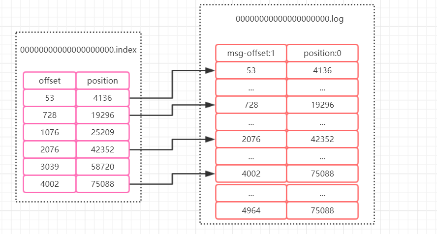 2. 找到索引文件后,根据 offset 进行定位,找到索引文件中的符合范围的索引。(kafka 采用稀疏索引的方式来提高查找性能)