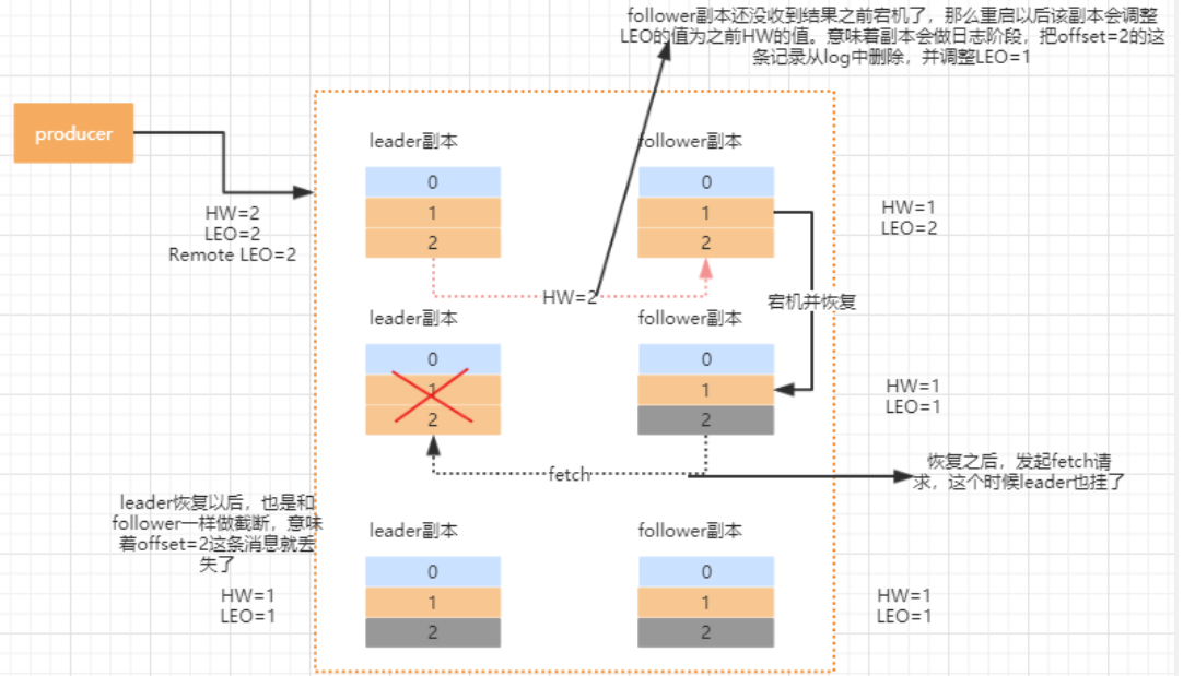 kafka 使用 HW 和 LEO 的方式来实现副本数据的同步,本身是一个好的设计,但是在这个地方会存在一个数据丢失的问题,当然这个丢失只出现在特定的背景下。我们回想一下,HW 的值是在新的一轮 FETCH 中才会被更新。我们分析下这个过程为什么会出现数据丢失