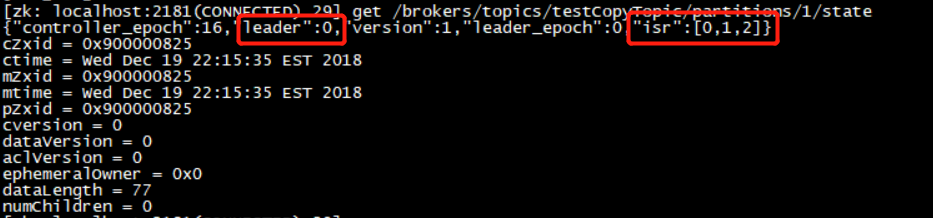 如何知道那个各个分区中对应的 leader 是谁呢?在 zookeeper 服务器上,通过如下命令去获取对应分区的信息, 比如 get /brokers/topics/testCopyTopic/partitions/1/state 这个是获取 testCopyTopic第 1 个分区的状态信息。 如下图,leader 表示当前分区的 leader 是那个 broker-id,这里即表示partition-1,即testCopyTopic-1这个分区的3个副本中,leader副本所处的位置是在broker-0这个节点上。