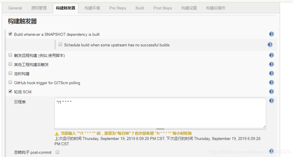 2、Jenkins定时构建cron语法--轮询 SCM 到每分钟,替代 svn 钩子 post-commit 提交后,每分钟检查是否有提交,有提交则自动构建,否则不做处理。